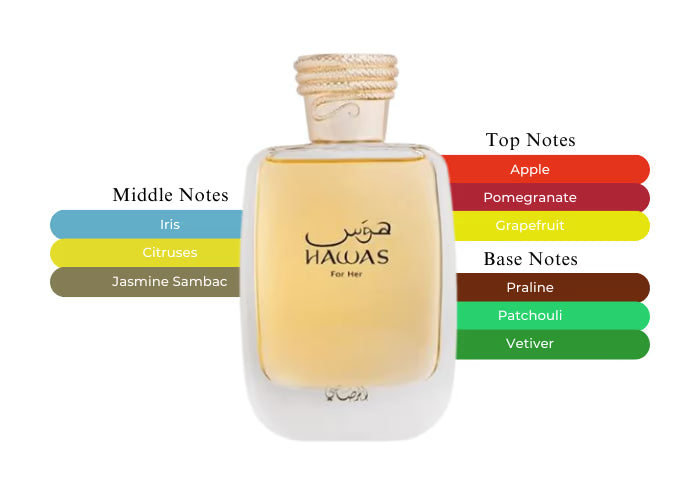 Rasasi Hawas for Her se ha posicionado como una de las fragancias más populares de la marca. Aunque comparte nombre con su contraparte masculina (Hawas for Him), su perfil olfativo es completamente distinto. Hawas for Her destaca por su originalidad y su gran desempeño, convirtiéndose en una opción favorita por su combinación de notas frutales y florales.